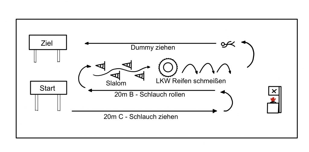 Der Parcours startet mit C-Schlauch ziehen und anschließendem Aufschießen einer Klappe mit dem Strahlrohr, anschließend muss ein B-Schlauch im Stehen aufgerollt werden, des weiteren durchläuft man einen Slalom und muss einen Traktorreifen (76kg) über eine bestimmte Strecke umwerfen und als letztes muss man einen Dummy ziehen.